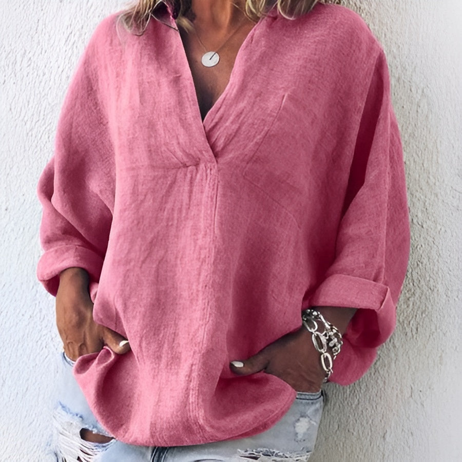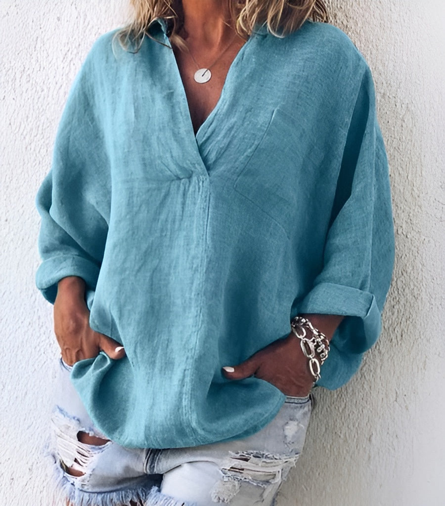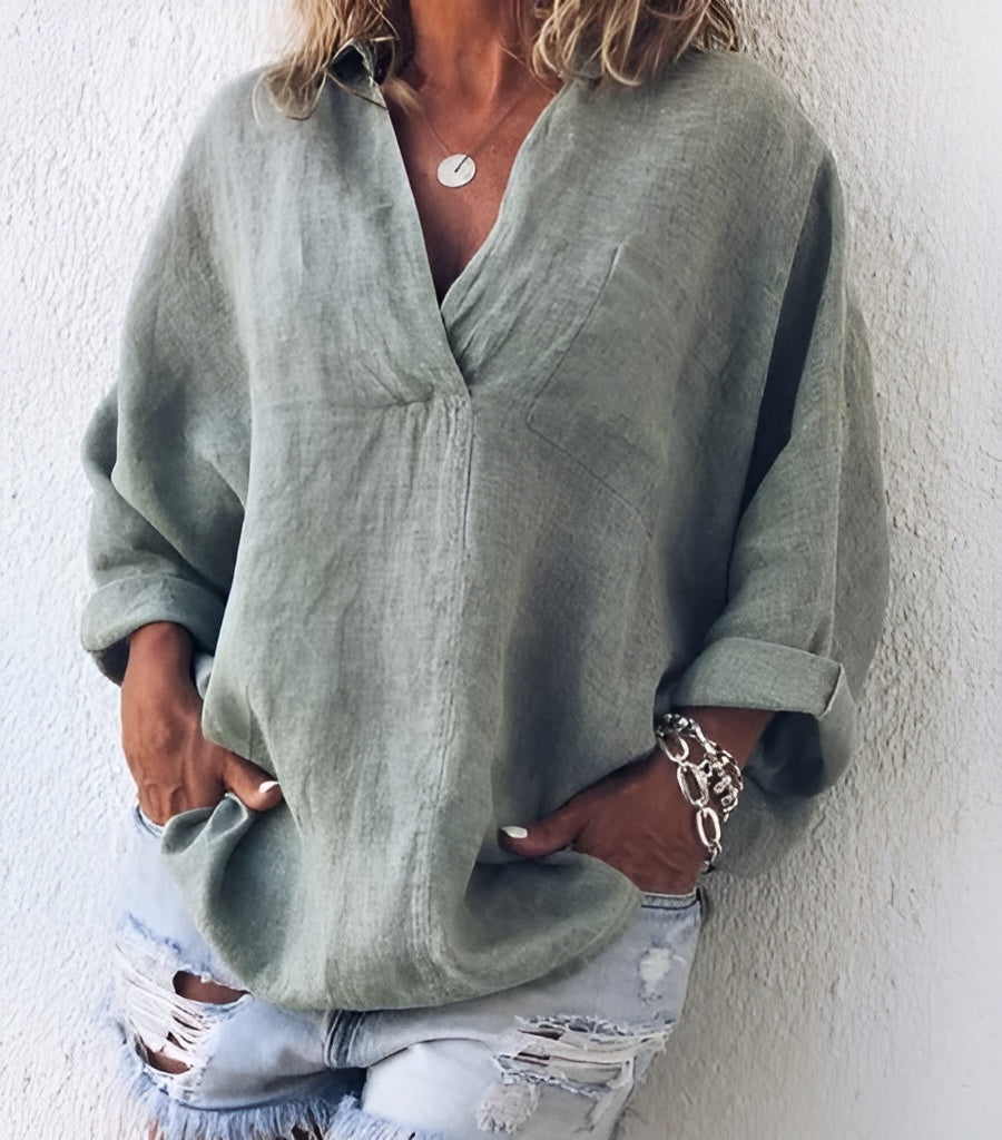 Maeve™ Top to lekka i przewiewna bluzka z bawełny i lnu, która zapewnia komfort i świeżość w ciepłe dni. Luźny krój daje swobodę ruchów, a elegancki design sprawia, że top pasuje na różne okazje. Neutralne kolory ułatwiają tworzenie wielu stylizacji.